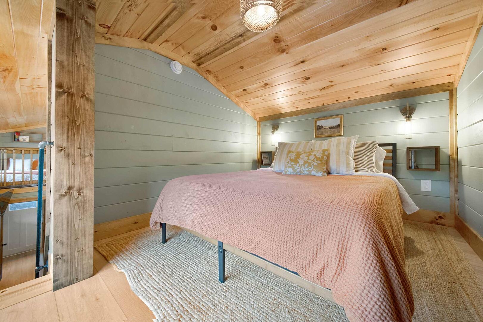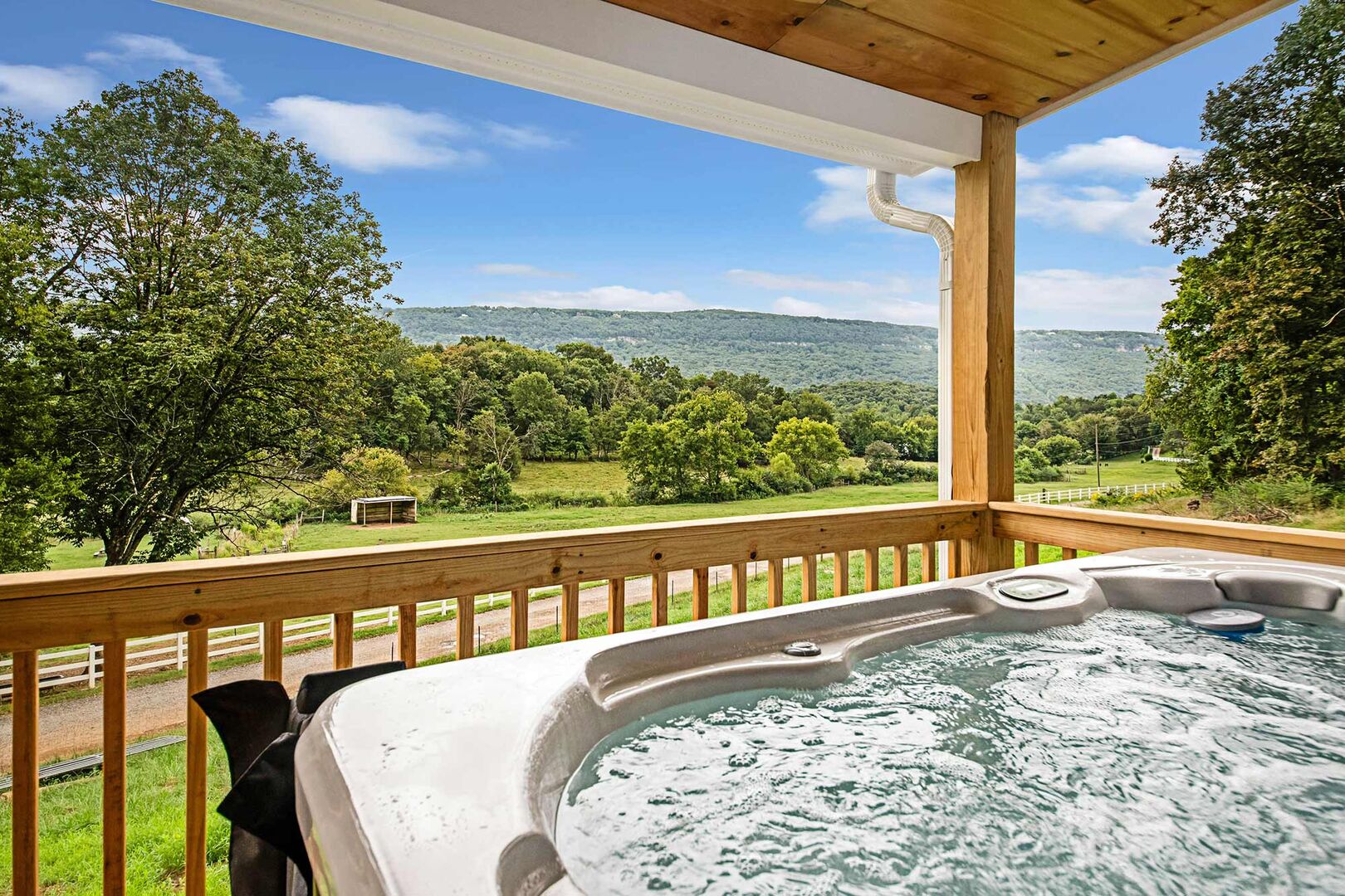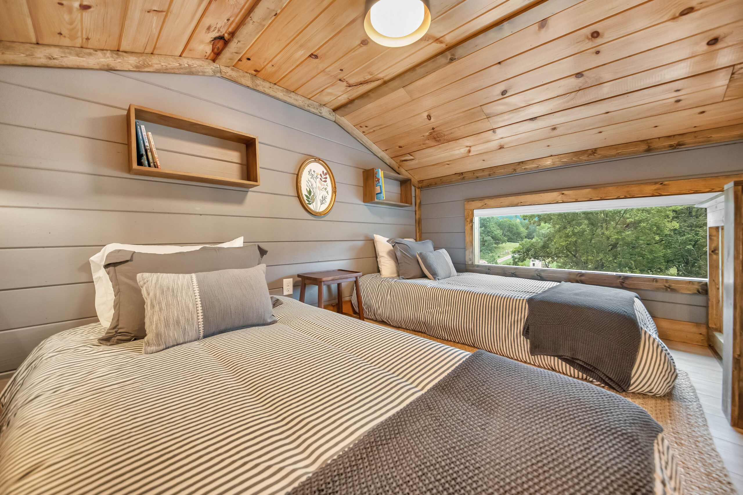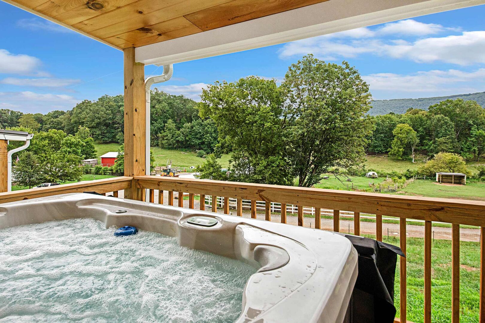 Welcome to the newest cabins on the farm, where rustic charm meets modern comfort. Each cabin offers a full kitchen with updated appliances, making it easy to cook and gather after a day outdoors. Two queen bedrooms and a shared loft with twin beds comfortably sleep 6–8 guests, giving everyone space to relax. Step outside onto the wide front porch, complete with hammocks, chairs, and a private hot tub overlooking the mountains.